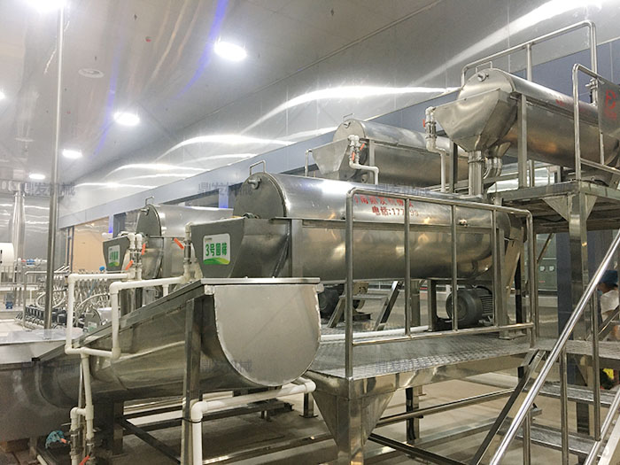 啟動園篩后應(yīng)打開中心軸噴水閥門,然后將粉碎后的粉漿均勻的送入進(jìn)料口,由螺旋推進(jìn)器等速的送入篩內(nèi),粉漿在螺旋升角為3-5°的旋轉(zhuǎn)毛刷與膠皮刮板的攪拌推動下,在篩內(nèi)翻滾前進(jìn),篩網(wǎng)采用無外支承架結(jié)構(gòu),這樣不僅提高了分離面積,而且還增加了篩網(wǎng)抖動,改善了分離效果。這種設(shè)備即利于排渣,毛刷又能刷去篩網(wǎng)表面的果膠,使篩分工作連續(xù)進(jìn)行。